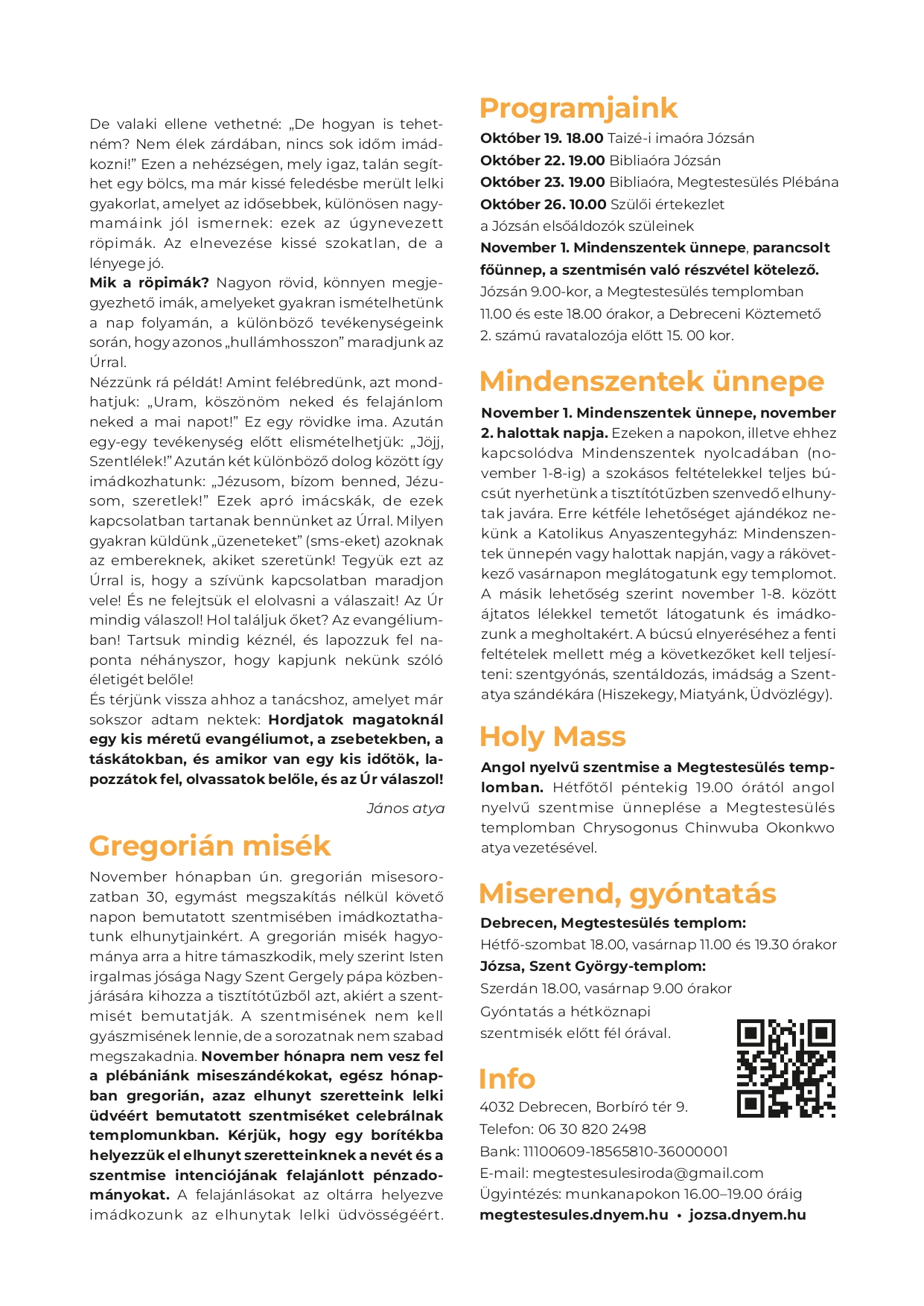 November hónapra nem vesz fel a plébániánk miseszándékokat, hanem egész hónapban ún. gregorián, azaz elhunyt szeretteink lelki üdvéért bemutatott szentmiséket celebrálnak templomunkban. A…