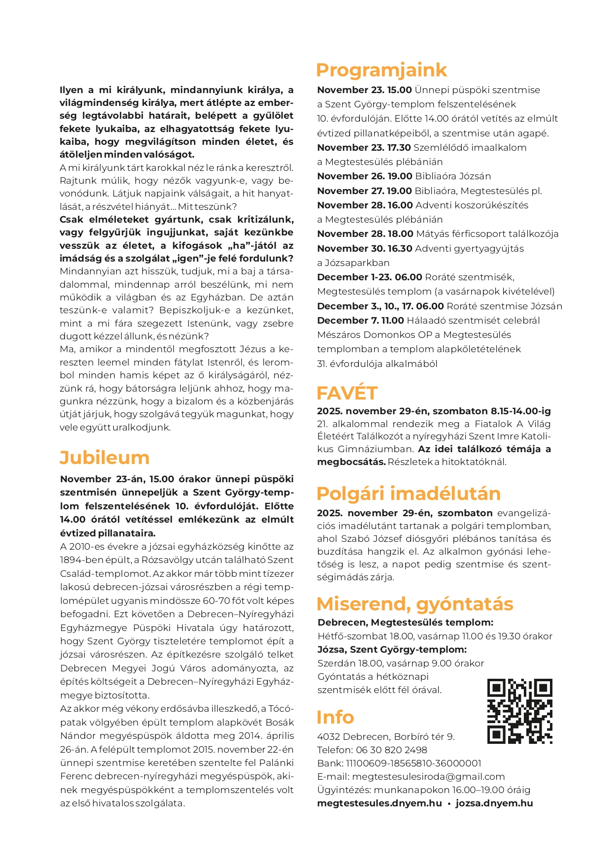 Szeptemberben megkezdődnek a plébániai hittanórák. A Megtestesülés plébánián az első foglalkozást szeptember 26-án tartjuk. Beiratkozás, ismerkedés szeptember 19-én. A hittanórák időpontja szeptember 26-tól…